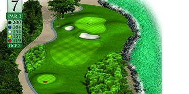 The second shot offers a view of a waterfall and takes you to a rather uneven green defended by two bunkers on the left side.
